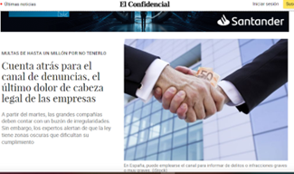 Desde Gómez de la Flor Abogados, nos permitimos remitirle este correo para recordarle que el próximo 1 de diciembre finaliza el plazo para la implantación de un sistema interno de información (canal de denuncias). Esta obligación es para empresas de 50 o más trabajadores, Administraciones y entidades del sector público, empresas de cualquier tamaño que operen en el mercado financiero, partidos políticos, sindicatos, organizaciones empresariales y fundaciones que reciban fondos públicos (Ley 2/2023 de 20 de febrero).